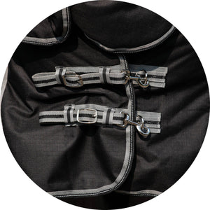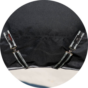 Detachable Elastic leg straps help keep the blanket in place. Our leg straps adjust from 20" to 38" and will stretch as horse moves. Set at optimum snugness and use the double brass-plated snaps for easy on and off.