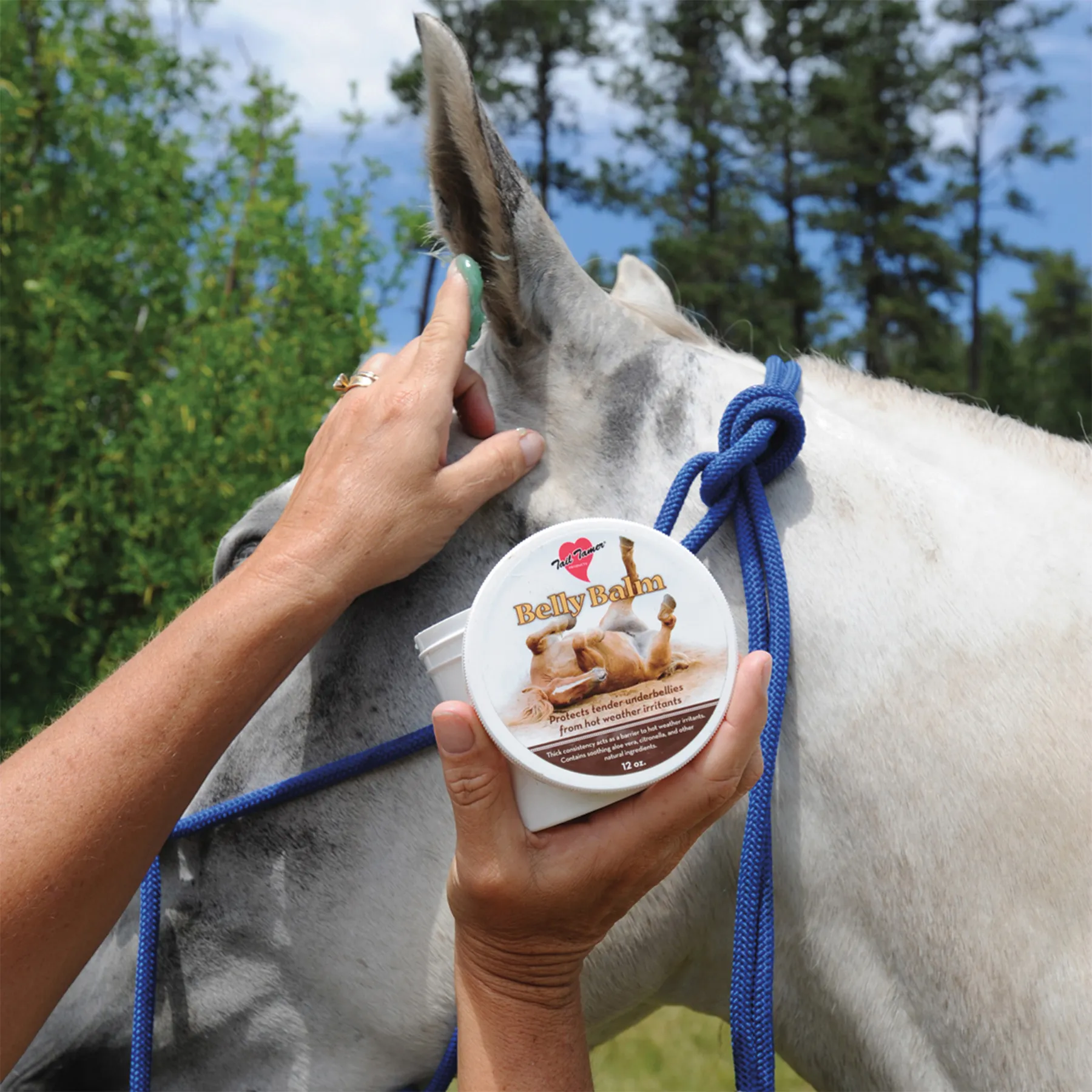 This soothing belly balm for horses provides a natural barrier against summer irritants. The thick consistency will not sweat off quickly and the aloe vera helps heal bites and wounds in tender underbelly regions. It can also be used to deter pesky gnats and no-see-ums from ears and other hard to reach areas.