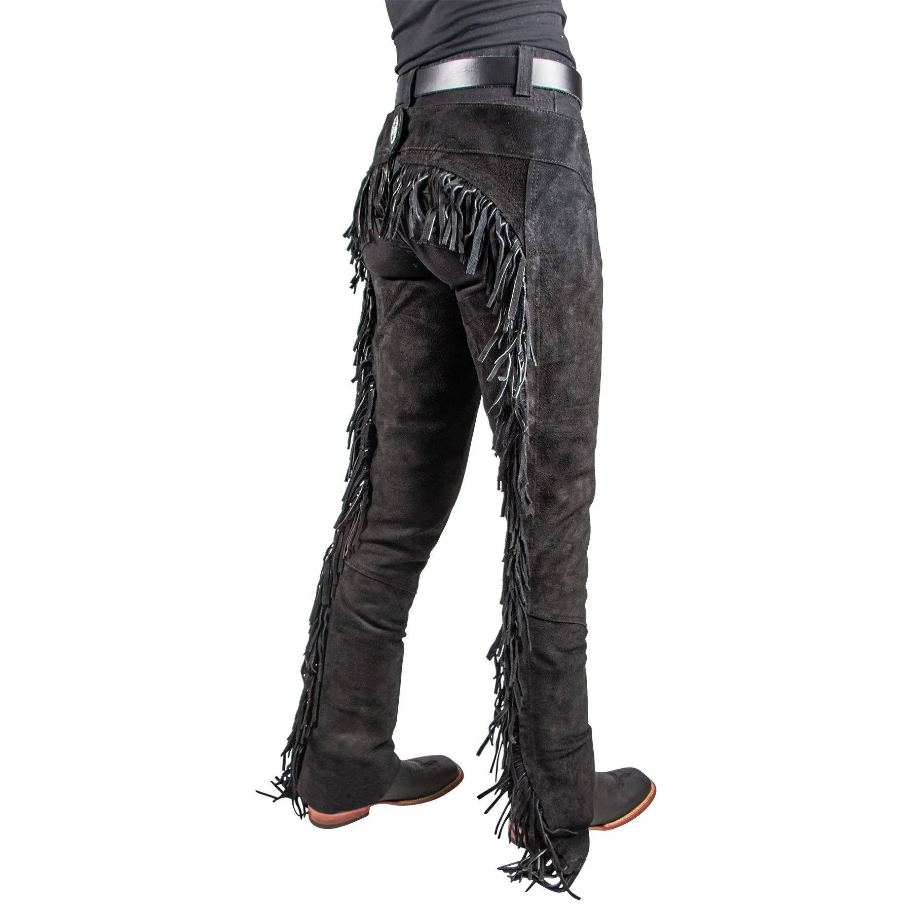 Economy suede western show chaps with wrap around rear with fringe, perfect for the beginner rider.