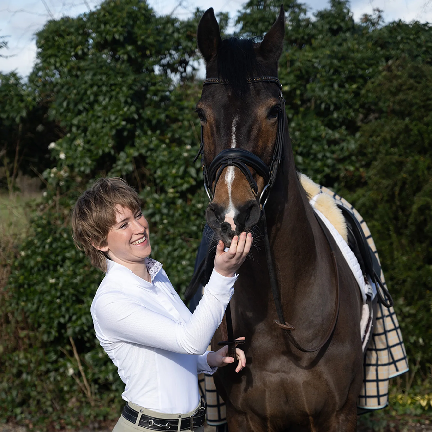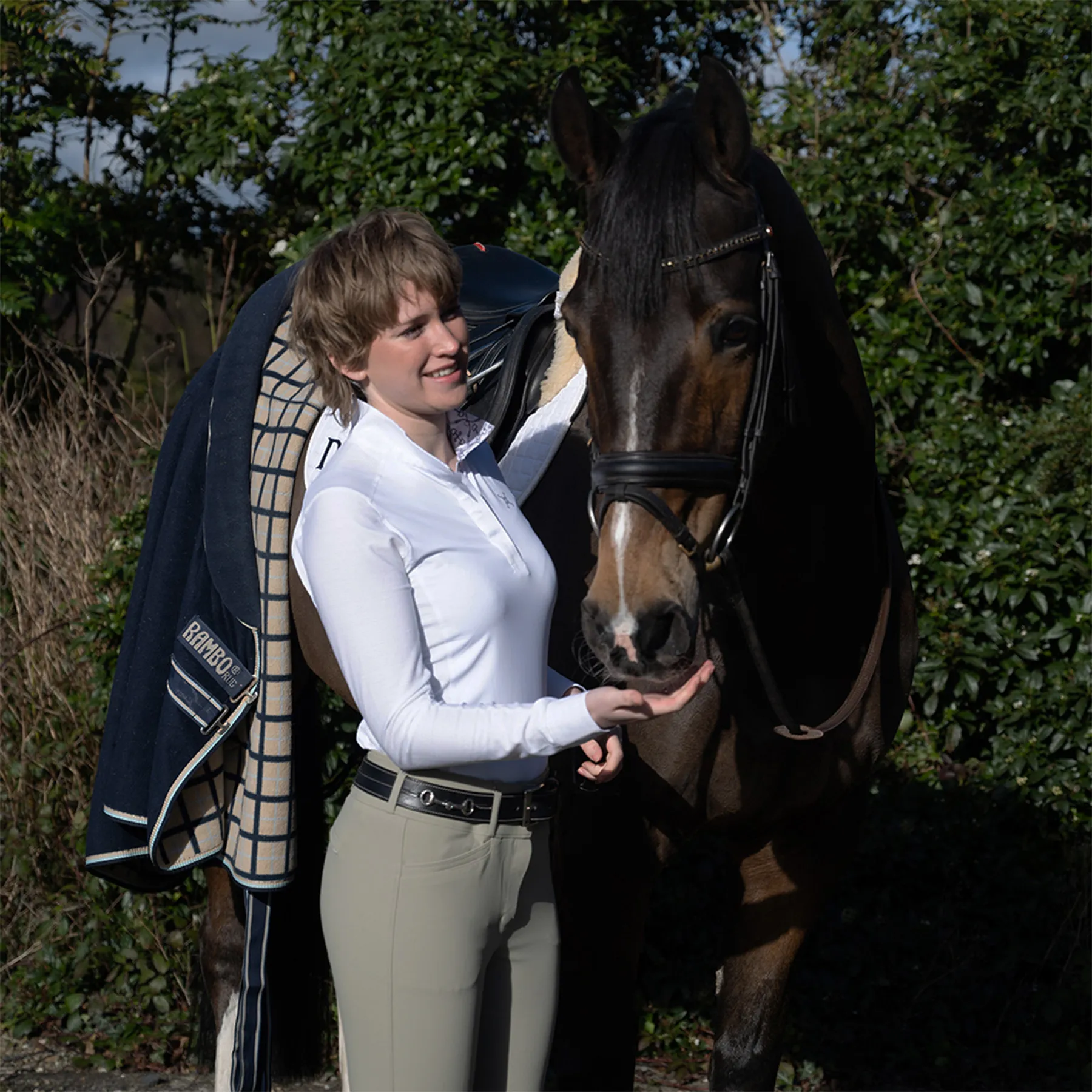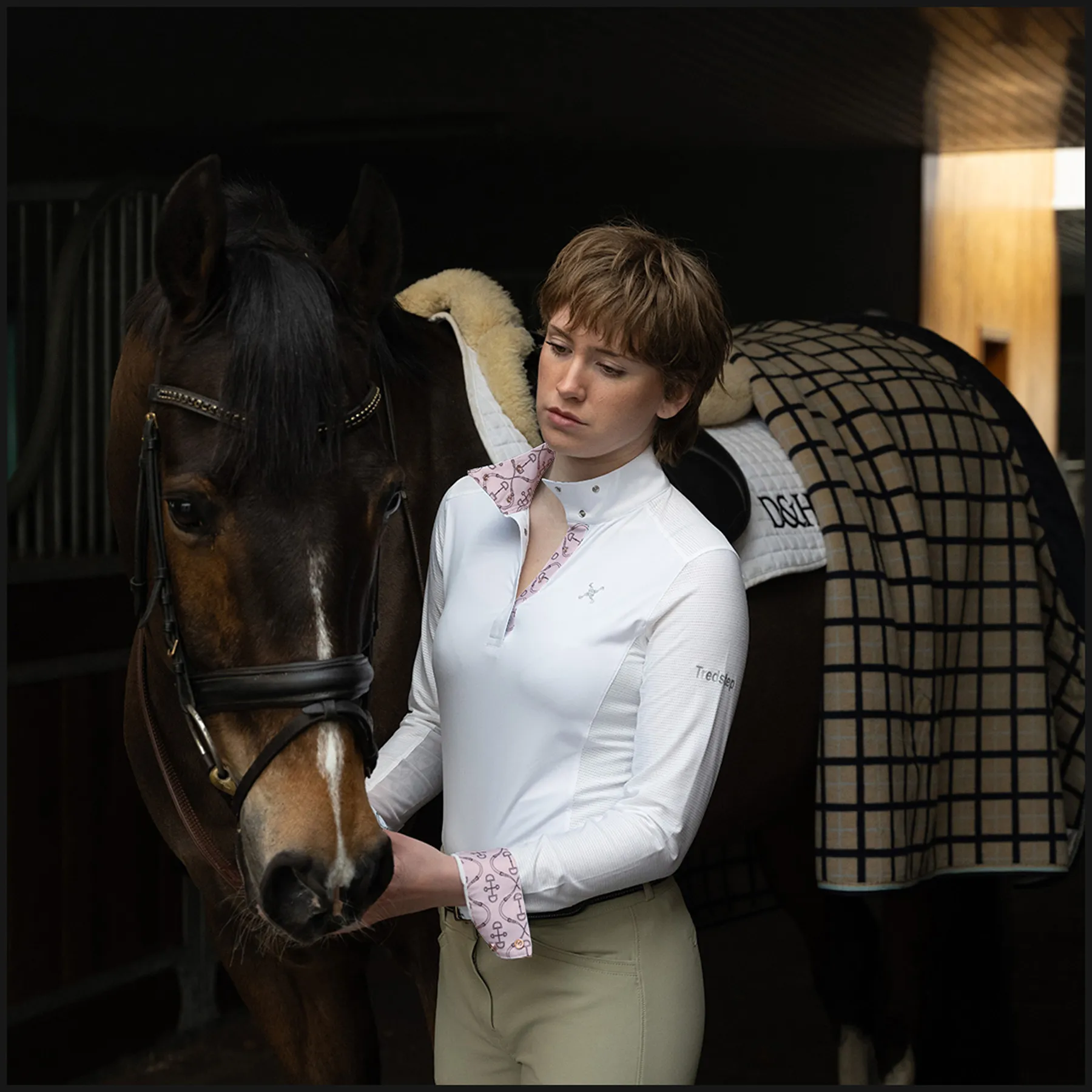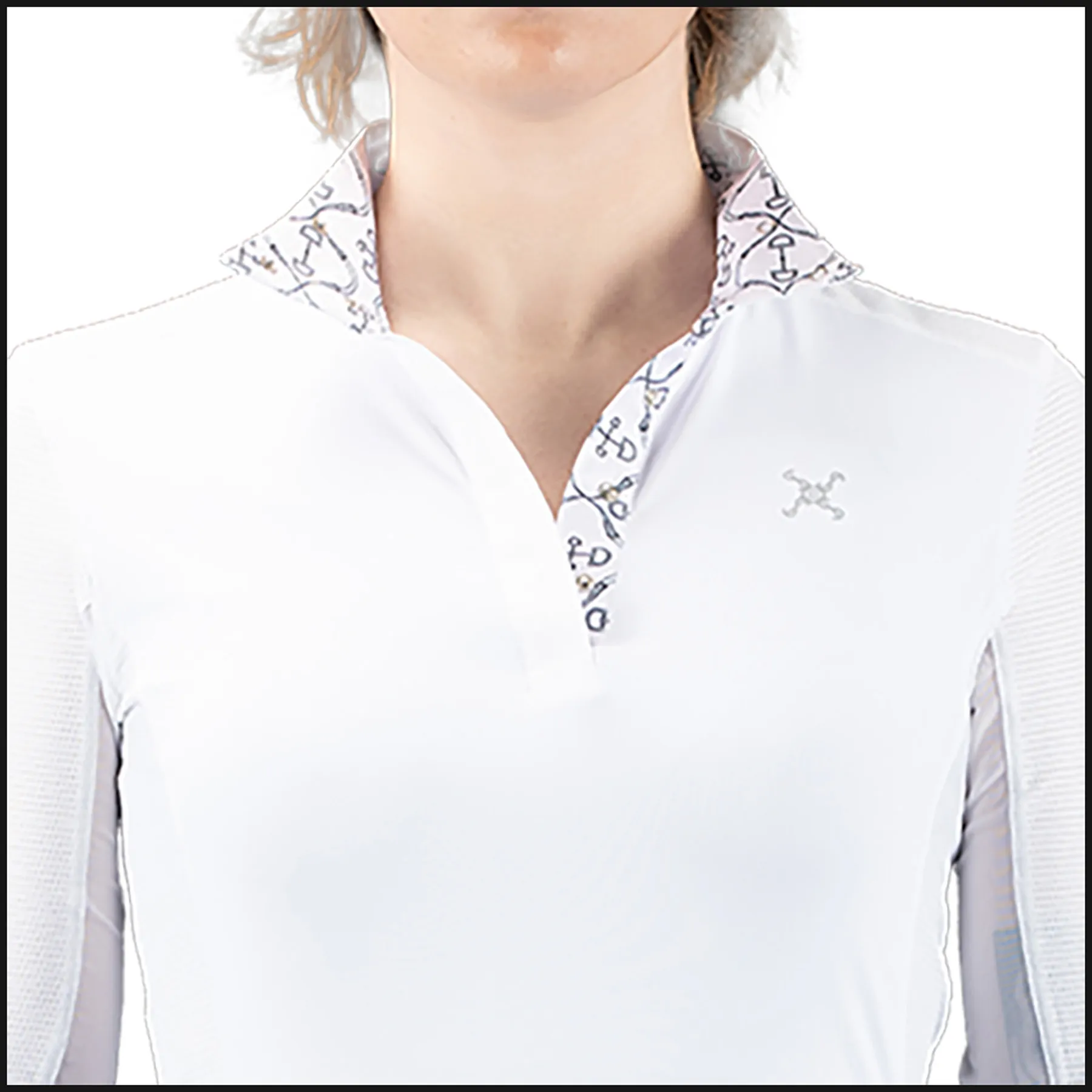 The Solo Milan Long Sleeve Competition Shirt by Tredstep Ireland features a crisp cotton wrap collar and cuff, lined with vintage equestrian prints and detailed with smart snap buttons. The fabric's natural cooling technology, jade stone, is added as it is formed and continues to work throughout its life. Many other so-called cooling fabrics have external finishes, such as Ice Fill, applied on top of the fabric, and these finishes and their effect disappear after several washes. Cooling Jade is the most efficient and natural way to cool continually.