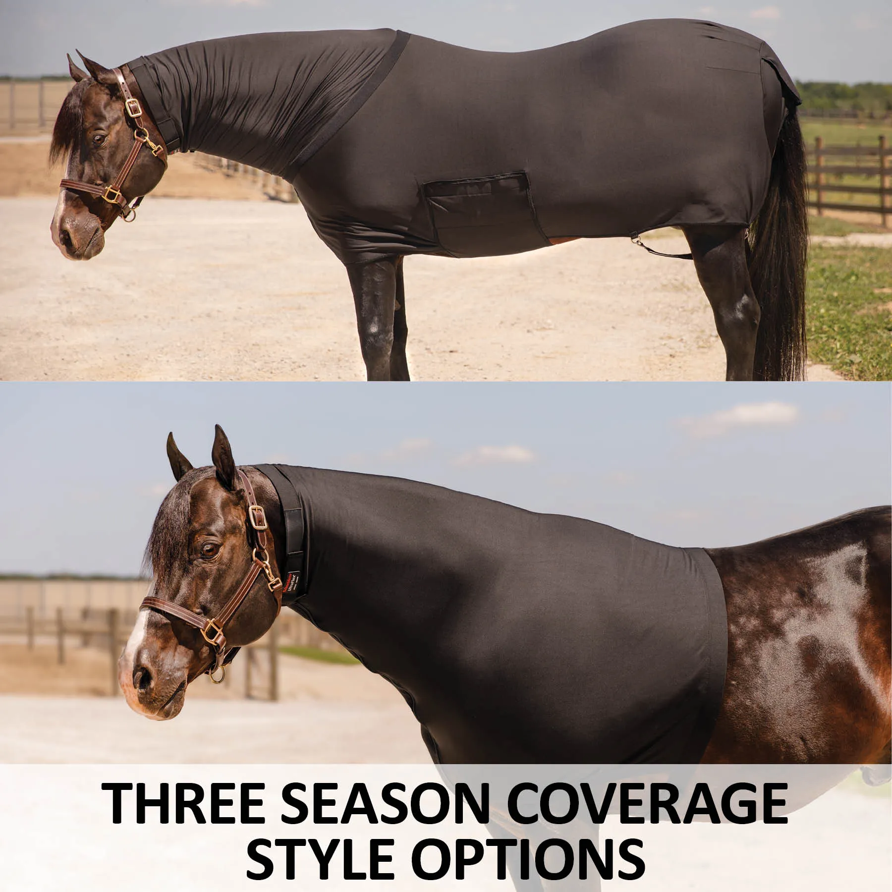 Our full-body and hood slickers are designed to keep your horse clean of dirt, dust, and shavings and to keep manes, braids, and bands lying flat. The fleece-lined lycra slicker's unique materials work together and offer 4-way stretch without the bulk. The fleece is woven into the lycra on the underside, keeping the top a slick lycra finish. Add warmth under your blankets or use it alone on cooler nights, during spring days, or in heated barns with this slicker.
