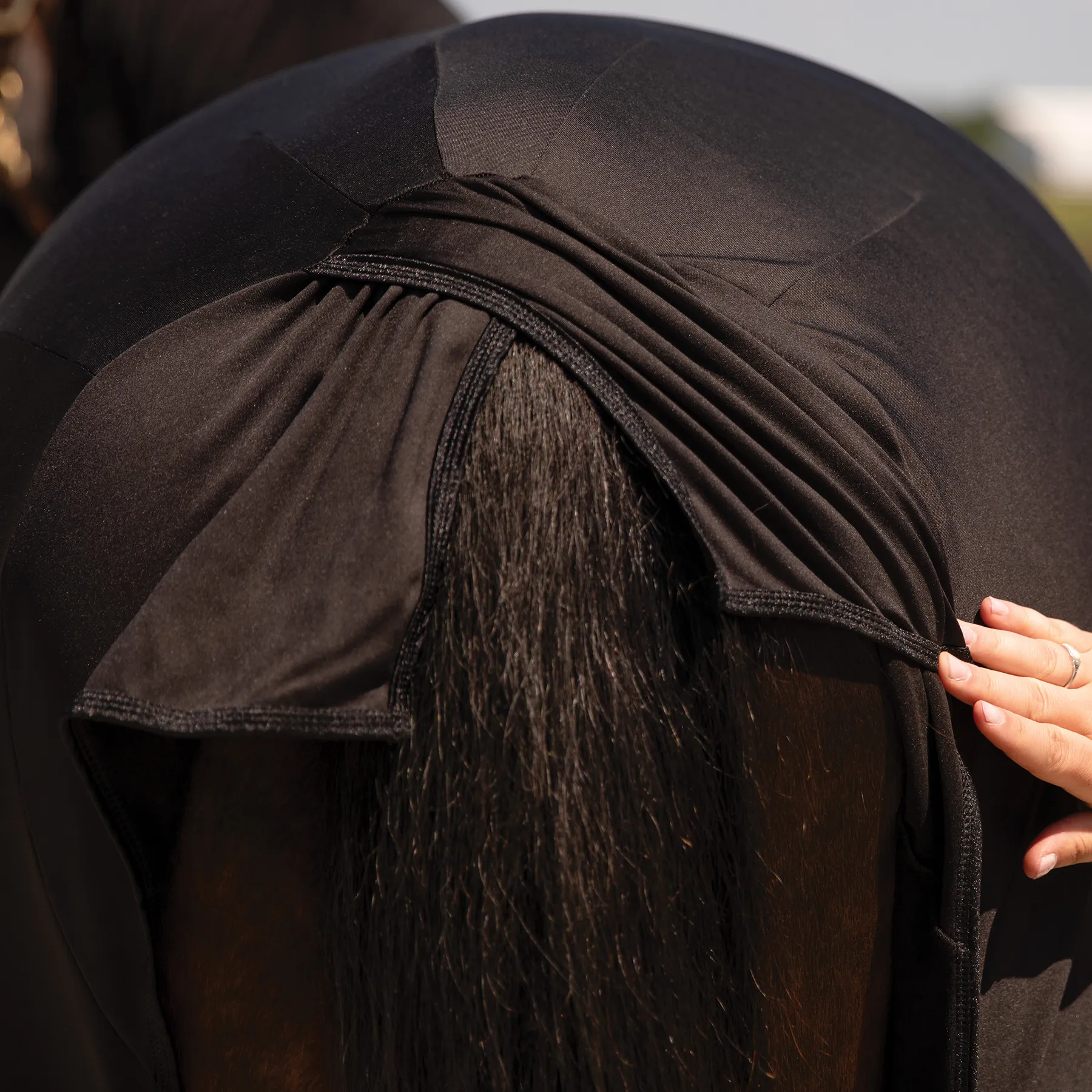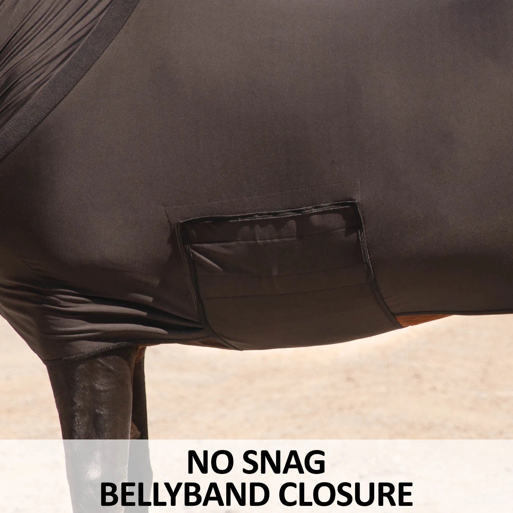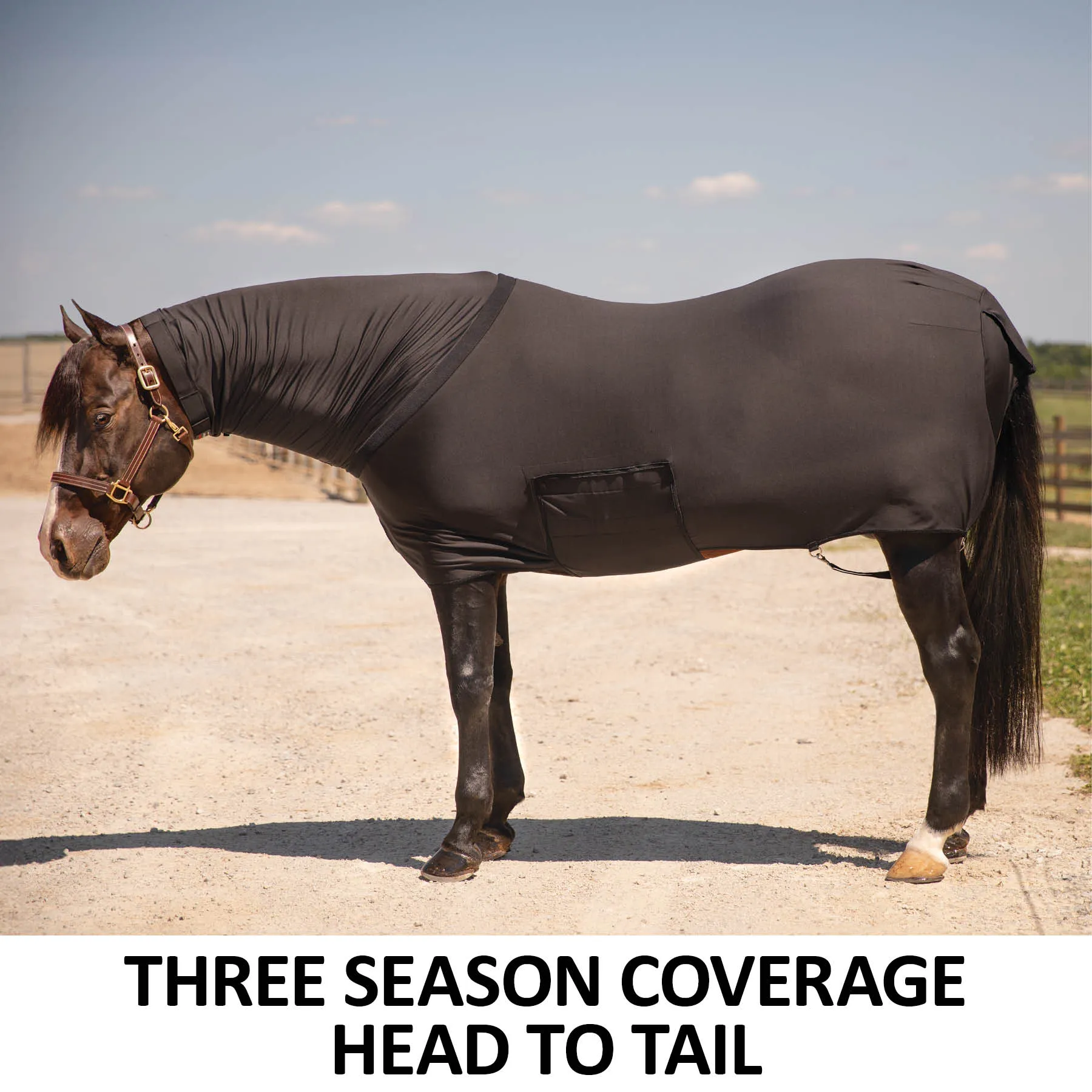 Our full-body slickers are designed to keep your horse clean of dirt, dust, and shavings and to keep manes, braids, and bands lying flat. The fleece-lined lycra slicker's unique materials work together and offer 4-way stretch without the bulk. The fleece is woven into our signature 8 oz. lycra on the underside, keeping the top a slick lycra finish. Add warmth under your blankets, or use it alone on cooler nights, spring days, and in heated barns with this slicker.