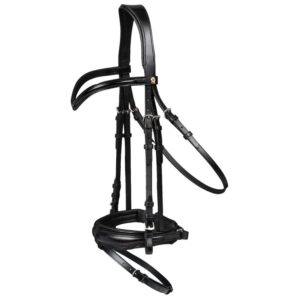 Turn heads in the arena with the Waldhausen S-Line Patent Bridle Blackshine, crafted for riders who value high-class elegance and top-tier comfort. Made from the finest European leather, this bridle features a broad, anatomically shaped headpiece for extra ear clearance and a softly padded pull-back noseband. The eye-catching V-shaped patent leather browband adds a sleek, polished finish to this premium piece of tack.